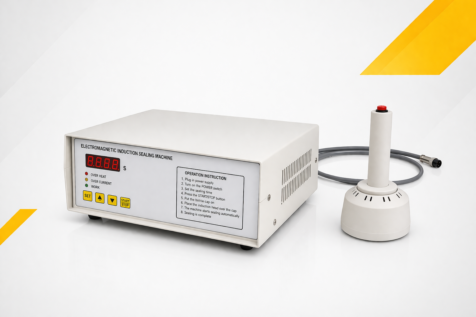 Machine professionnelle de scellage des bouchons par induction électromagnétique, assurant une fermeture hermétique rapide et efficace. Idéale pour les produits alimentaires, cosmétiques et pharmaceutiques.